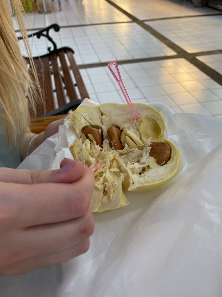 Kolejnym marketem, który odwiedziłam był Or Tor Kor Flower Market, jeden z topowych bazarów spożywczych na świecie. To miejsce polecam każdemu kto ekscytuje się na widok – i smak – świeżych, egzotycznych owoców, warzyw i ryb. Na markecie wystawiają się prawdziwi rolnicy z różnych części Tajlandii, prezentujący produkty pochodzące z ich własnych upraw. Świeżość gwarantowana. Znajdziesz tutaj pachnące przyprawy, owoce morza i nie tylko: najpyszniejsze mango, papaje, kokosy, dragon fruity, jak i rambutany oraz (gwóźdź programu) duriany! Tak, to właśnie w tym miejscu spróbowałam mojego pierwszego w życiu duriana, owoca okrzykniętego najbardziej śmierdzącym na świecie i szczerze mówiąc myślałam, że będzie pachniał o wiele gorzej! Różnych ciekawostek się o durianie nasłuchałam, łącznie z tym, że w tajskich hotelach wiszą zakazy przetrzymywania ich w pokoju, ze względu na smród, którego bardzo ciężko się potem pozbyć. Moim zdaniem jednak był to zapach zdecydowanie do zniesienia – chyba gorzej ze smakiem. Smakował jak połączenie soczystej cebuli i mango – z tego co pamiętam tak właśnie go po pierwszym kęsie określiłam. Niestety nie dałam rady zjeść nawet całego, ale wyobrażam sobie, że wiele osób może w nim gustować i bez wątpliwości jest warty spróbowania.