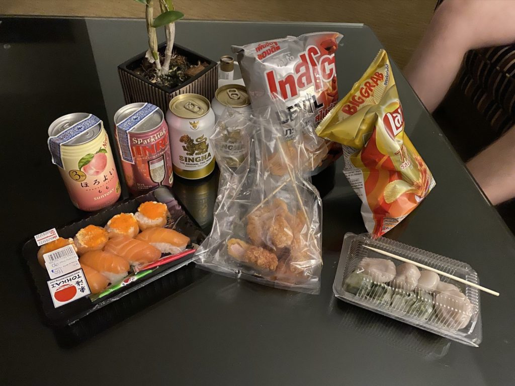 Powyższe miejsca, które opisałam to najsłynniejsze rynki z tajskim jedzeniem w Bangkoku. Z urok street foodu można skorzystać jednak na każdym rogu! Owoce morza, ryby, mięsa, dania z ryżem, makarony, smoothies, naleśniki i wiele więcej – takie potrawy dostaniesz wszędzie. I pamiętaj – im mniej znane miejsce tym niższa cena, a jakość i smak porównywalnie dobre. Najlepiej wspominam ucztę z ostatniego dnia w Bangkoku – nakupowaliśmy na wynos mnóstwo dań i przekąsek i urządziliśmy sobie prawdziwą biesiadę w pokoju hotelowym. Wieprzowina z ryżem w sosie orientalnym, chrupiące krewetki i kraby w tempurze, tajskie pierożki na parze, grillowane szaszłyki, no i nie zapominajmy o największym hicie – sushi z supermarketu! Dla mnie, największej fanki sushi na świecie, to był prawdziwy raj! Tajskie sushi, prosto z marketu to niebo a ziemia w porównaniu do tego co mamy w polskich sklepach. Z ręką na sercu, jakościowo było tak samo dobre jak to co dostajemy u nas w knajpach. Za taki kompletny set przeróżnych dań zapłaciłam maksymalnie 200 ฿, czyli ok. 25 zł (szok). Do tego na przekąskę do filmu chipsy krabowe, piwko Singha (cud miód!), śmieszne winko w puszce o smaku lychee, widok na panoramę Bangkoku z balkonu i pełnia szczęścia osiągnięta 😉