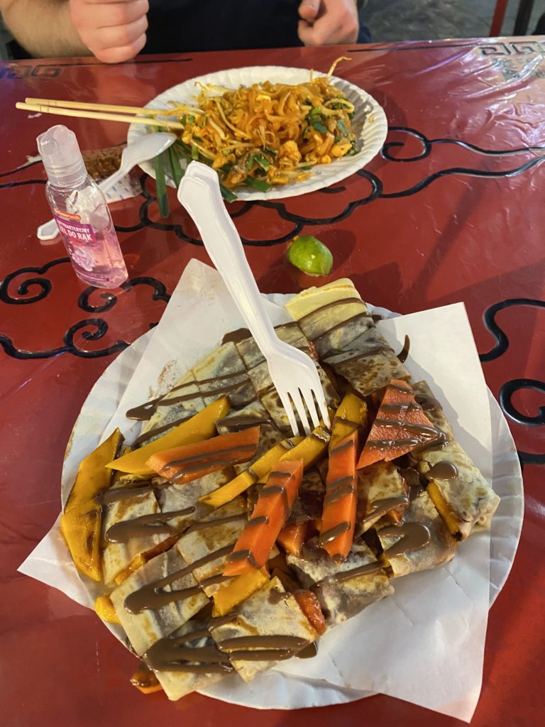 Ostatnim food marketem, który udało mi się zwiedzić był Phetchaburi Soi 5, o klimacie nieco odmiennym od pozostałych. Jest to długa ulica, z której rozciąga się wiele mniejszych. Znajdziesz tu zdecydowanie więcej dań i przekąsek aniżeli owoców, koktajli, przypraw, czy ubrań i rękodzieł. Jest tu też mnóstwo małych restauracji, gdzie jedzenie może również zostać podane Ci do stołu. Sporo krążyliśmy zanim zdecydowaliśmy się na wybór miejsca, ale jedno czego nauczyłam się w Tajlandii to fakt, że street food to street food, nie elegancka restauracja i nie można się bać próbować potraw, nawet jeżeli stanowisko gdzie je sprzedają nie wygląda porywająco. Jeżeli Ciebie również złapie taki lęk to moja rada: nie wybrzydzaj i nie krąż w poszukiwaniu dogodniejszego miejsca, tylko odważ się na spróbowanie potrawy, która podoba Ci się sama w sobie! Później jest już łatwiej. Osobiście najbardziej zachwyciły mnie khanom krok, czyli kokosowe kulki, zapiekane jak gofry, chrupiące na zewnątrz, kremowe w środku – mniam!